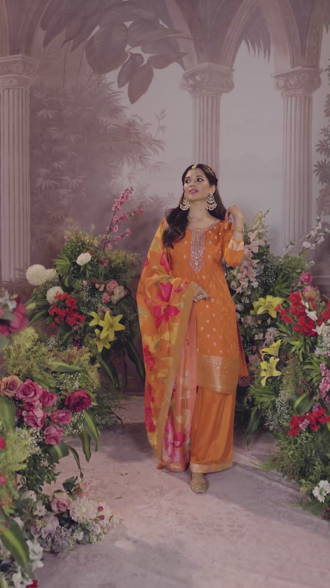 This vibrant three-piece set combines beautiful texture and bold color, perfect for festive occasions. It features a richly woven Brocade Silk kurta with subtle Zari motifs, wide-leg palazzo pants in fluid Chinon Silk, and a striking, contrast Muslin Silk dupatta with a lively floral print.