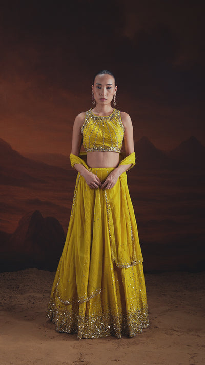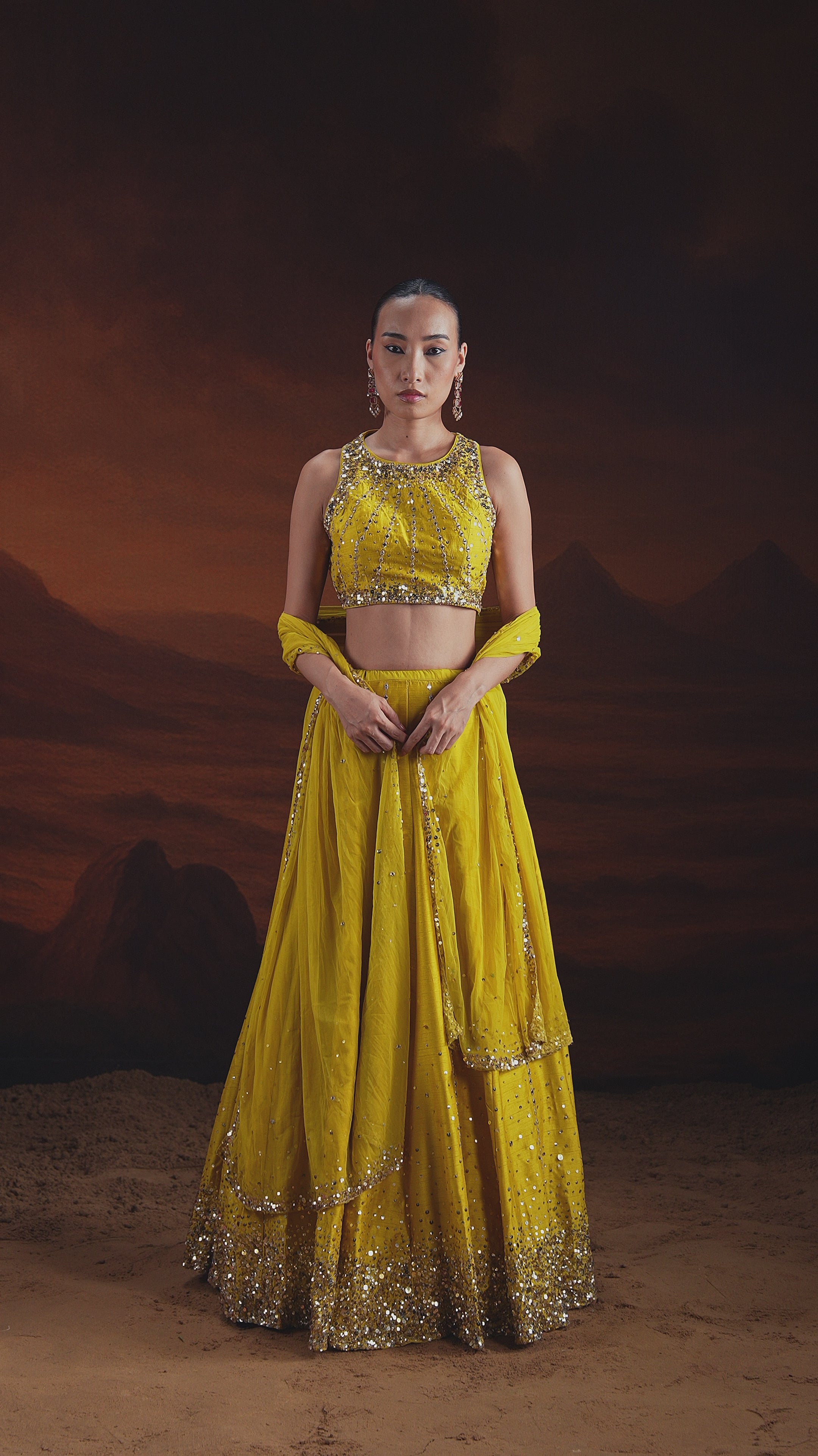 This beautiful lehenga set is crafted from luxurious raw silk, which gives it a rich texture and elegant drape. The outfit is heavily embellished with all-over work that includes shimmering sequins, intricate mirror work, and delicate thread work, creating a dazzling effect. The look is completed with a light and airy net dupatta, which provides a beautiful contrast to the heavy work of the lehenga and choli.