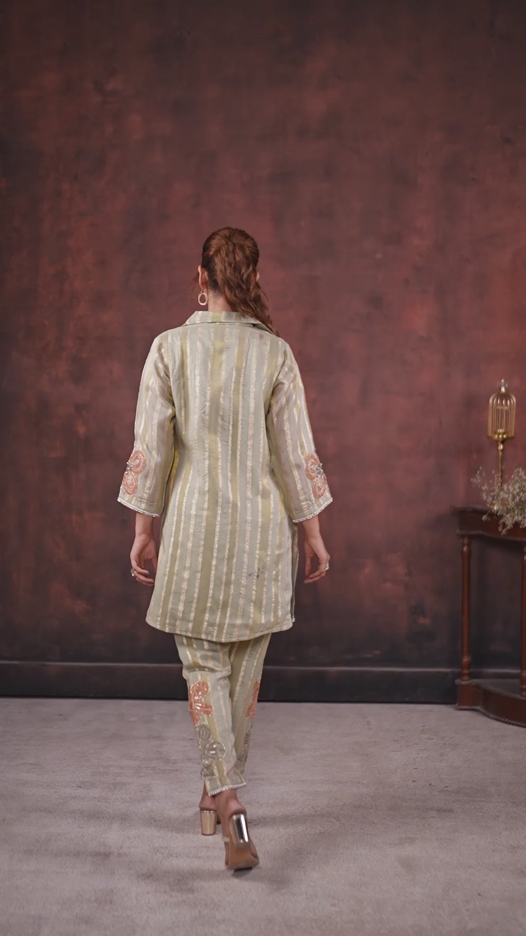 Crafted from luxurious tissue jacquard silk, this set features a soft golden hue with vertical metallic stripes for a subtle shimmer.
