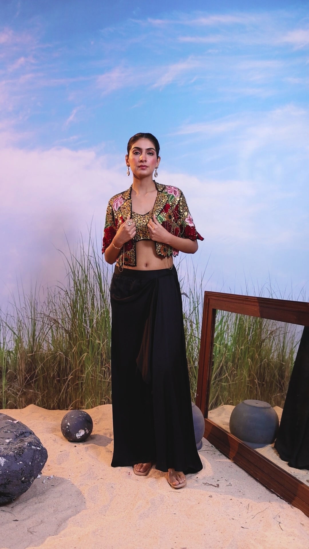 This elegant 3-piece satin silk set features a draped skirt, crop top, and an embellished jacket adorned with sequins, cut dana, beads, and intricate thread embroidery, creating a perfect blend of modern charm and traditional craftsmanship.