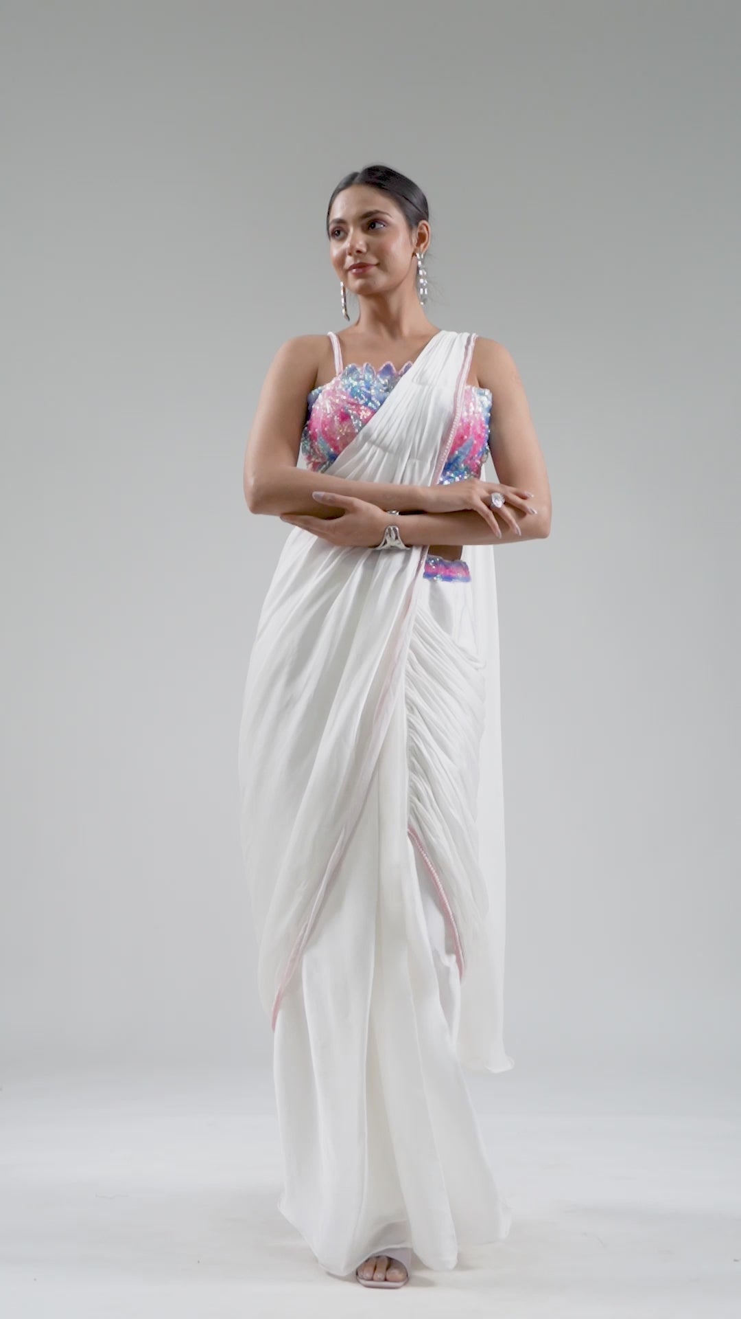 White embellished premium chinon silk padded blouse. Crafted with sequin and bead handwork embroidery. Paired with matching solid draped saree. Apt for semi formal wear.