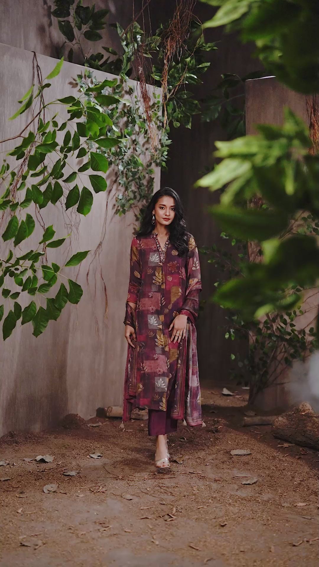 Showcasing autumnal elegance, this Wine Pant Set is a three-piece ensemble in lustrous Chinon Silk. It features a graceful kurta and dupatta with a rich, multi-colored Patchwork-style Botanical Print, complete with a solid matching pant.