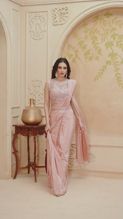 A contemporary Blush Pink pre-stitched saree featuring a smooth, crepe silk drape, paired with a heavily embellished, sleeveless blouse and a delicate waist belt.