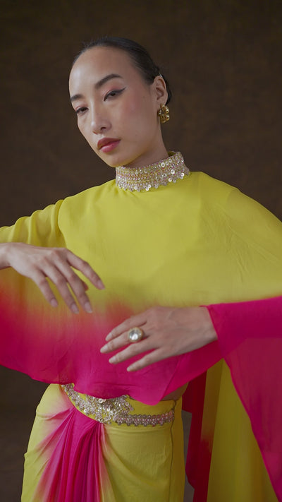 Make a vibrant splash in this dramatic Fuchsia & Neon Yellow Ombré Set. Crafted from flowing chinon silk, this two-piece ensemble features a beautifully draped ombré skirt and a coordinating crop top. The top is styled with wide, flowing sleeves and an intricately hand-embellished choker neck, featuring dazzling sequin, zari, bead, and thread work.