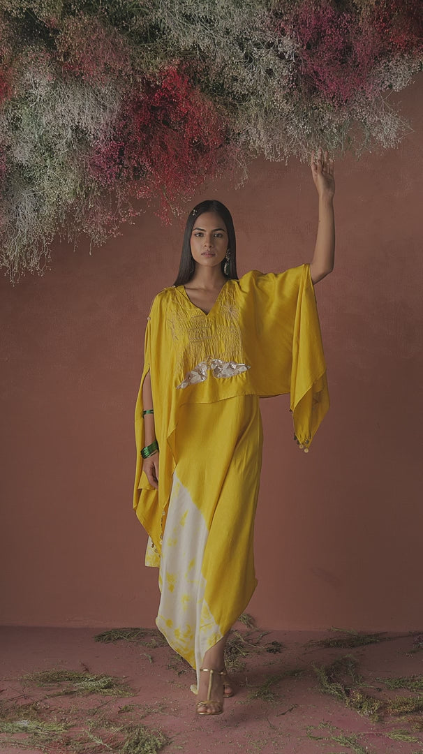 Turn heads in this vibrant Mustard Yellow Raw Silk Asymmetric Dress, elevated with a flowing cape and exquisite handcrafted details.