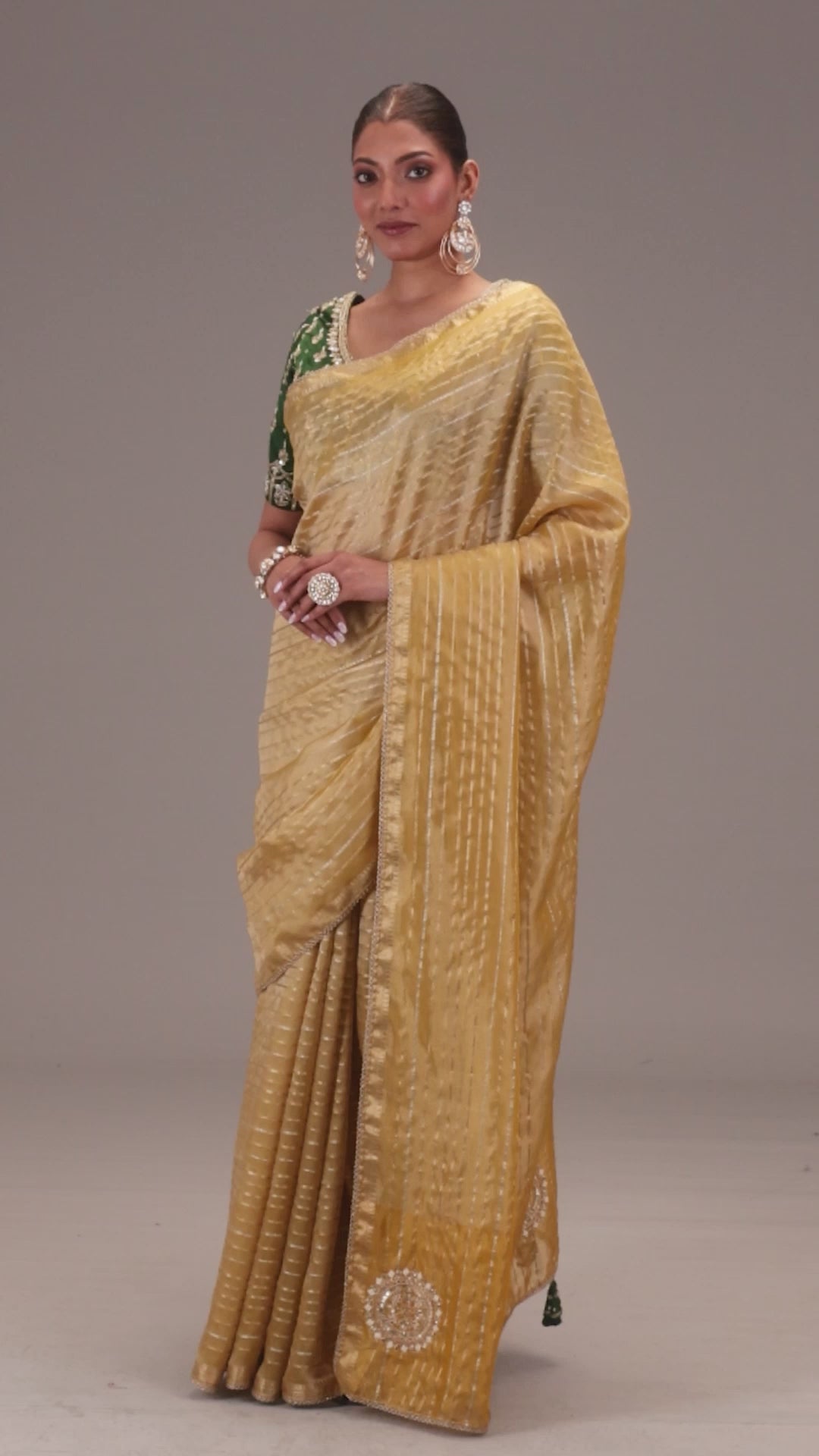 Redefined the traditional look with our Daisy Yellow Tissue Silk Saree. Adorned with a dazzling mirror, golden banarasi, sequins, beads and aari tari work with scalloped border and resham thread tassels on drop. It completes the look with contrast blouse. An ensemble that makes an unforgettable entrance and leave a lasting impression at all your year-round festivities.