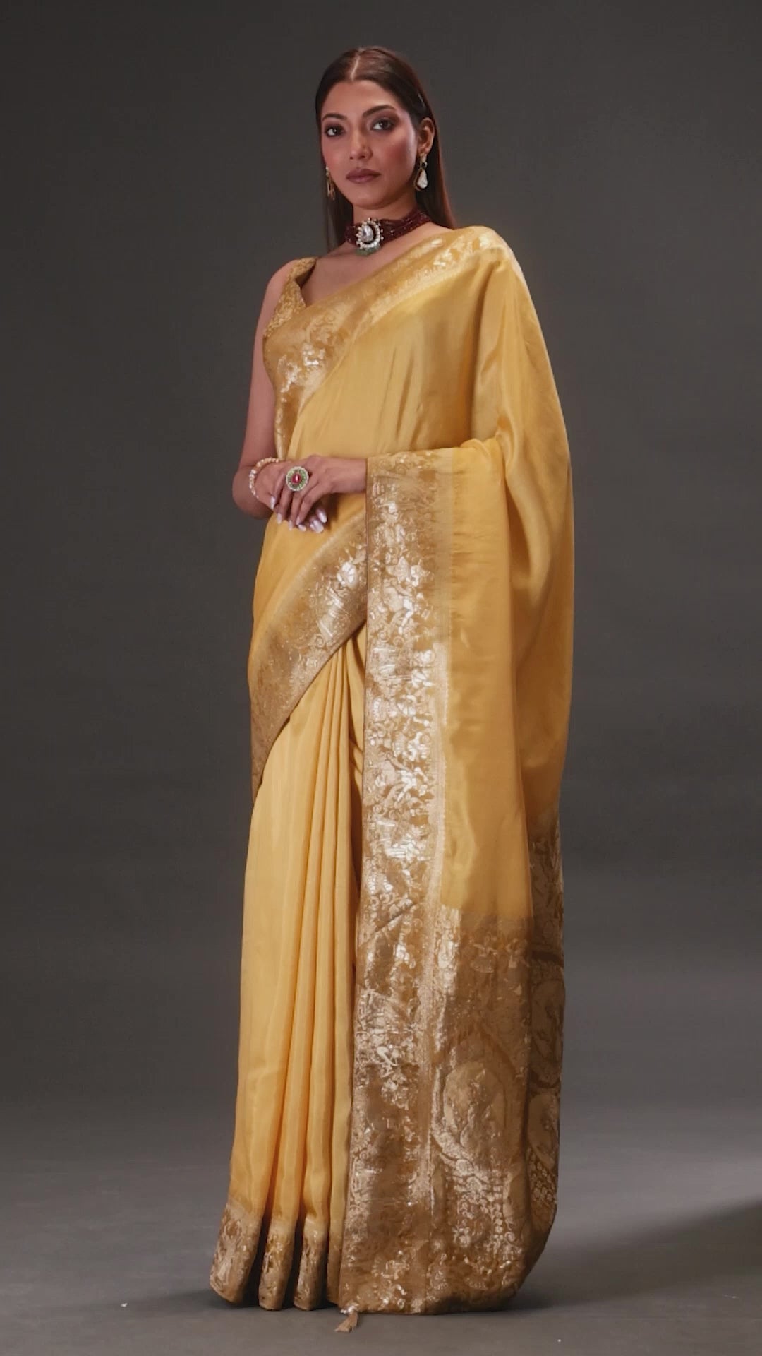 Discover our elegant Yellow Zari Woven Dola Silk Saree. Made from luxurious Dola silk, this saree showcases stunning zari woven work. Complete with a matching blouse, this saree is perfect for any occasion. Elevate your wardrobe with this timeless and sophisticated piece.